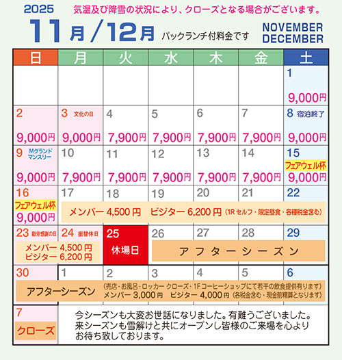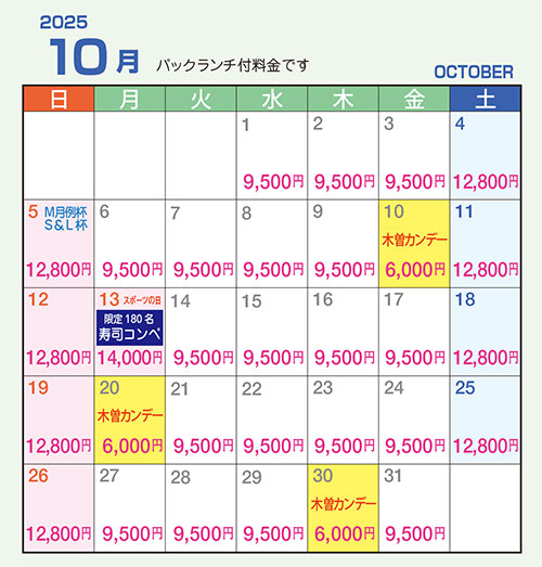 HOME > お知らせ >2025シーズンカレンダー 2025年10月10日 https://kisocc.co.jp2025シーズン木曽カントリー高原の爽やかな風の中でナイスショット!2025シーズンも木曽カントリー俱楽部よろしくお願いいたします。information9月 連休の御予約はお早目に!!皆様のご来場お待ちしております。 ご不明な点がございましたらお問い合わせくださいWebからのエントリーはこちら